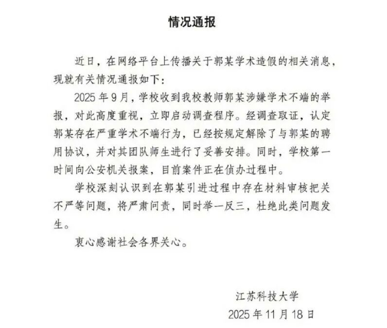 11月18日,江苏科技大学通报称,认定郭某存在严重学术不端行为,已按规定与其解聘并已向公安机关报案。