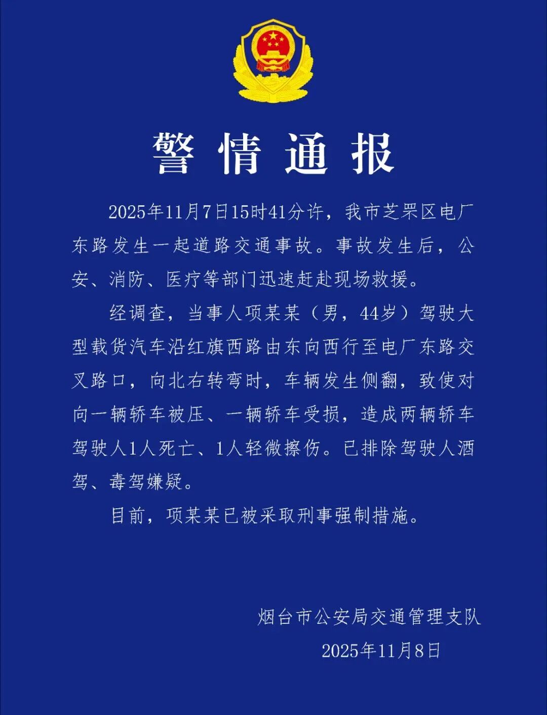 11月7日,烟台市芝罘区道路上发生一起车祸,一辆大型载货汽车在十字路口转弯时车辆侧翻,整个车身压在一辆轿车上,轿车直接被掩埋,事故造成车上驾驶员死亡。事发后,公安、消防、医疗等部门赶到现场救援。11月8日,烟台交警通报,货车司机项某某已被采取刑事强制措施。