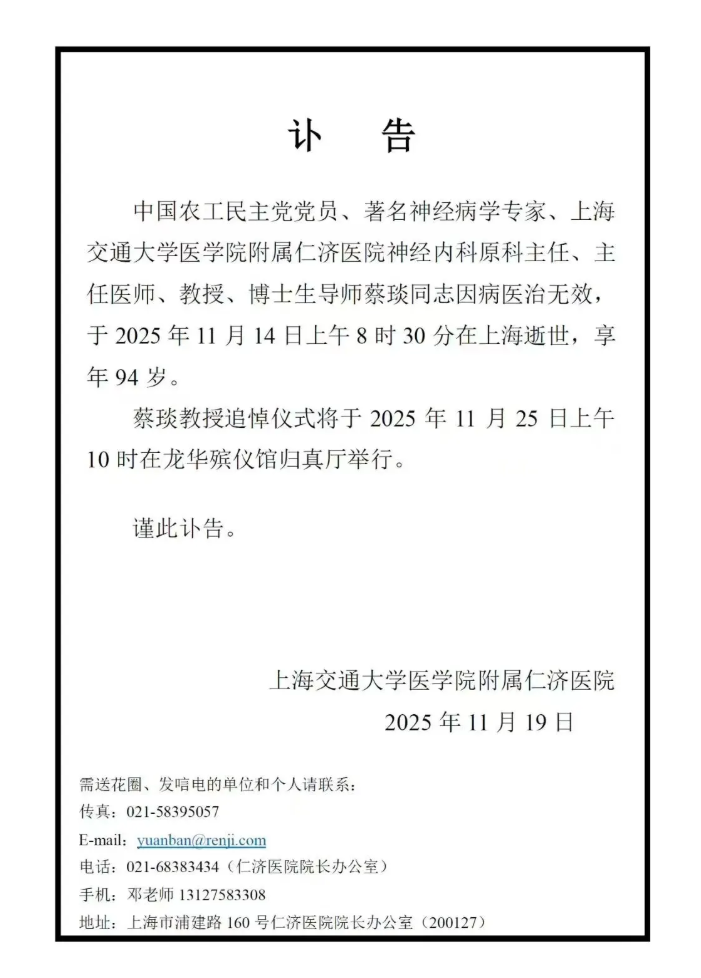 著名神经病学专家蔡琰教授逝世,享年94岁