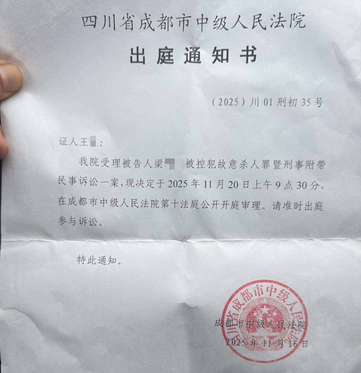 母亲王女士告诉华商报大风新闻记者,前几天她收到了成都市中级法院的一份出庭通知书,称该法院受理被告人梁某滢被控犯故意杀人罪暨刑事附带民事诉讼一案,决定于2025年11月20日上午9:30在第十法庭公开开庭审理,希望作为证人的她准时出庭参与诉讼。