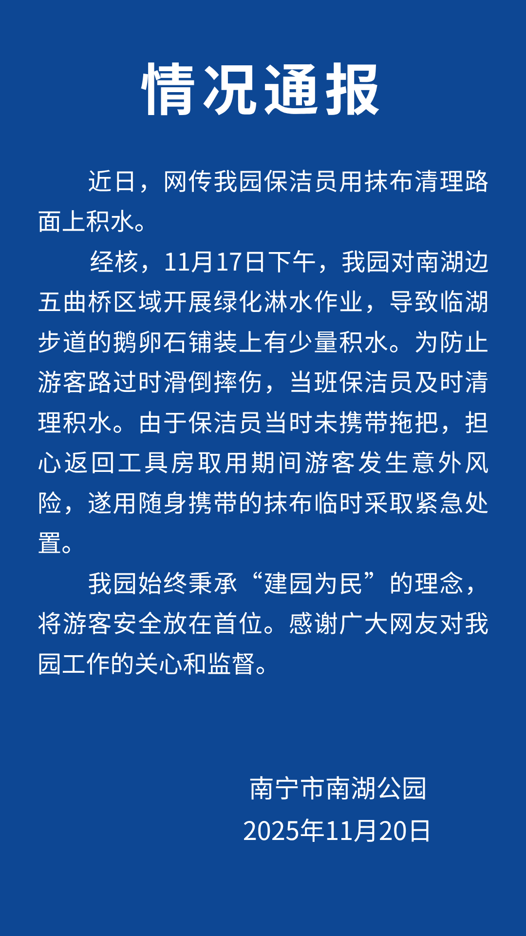 经核,11月17日下午,我园对南湖边五曲桥区域开展绿化淋水作业,导致临湖步道的鹅卵石铺装上有少量积水。为防止游客路过时滑倒摔伤,当班保洁员及时清理积水。由于保洁员当时未携带拖把,担心返回工具房取用期间游客发生意外风险,遂用随身携带的抹布临时采取紧急处查。