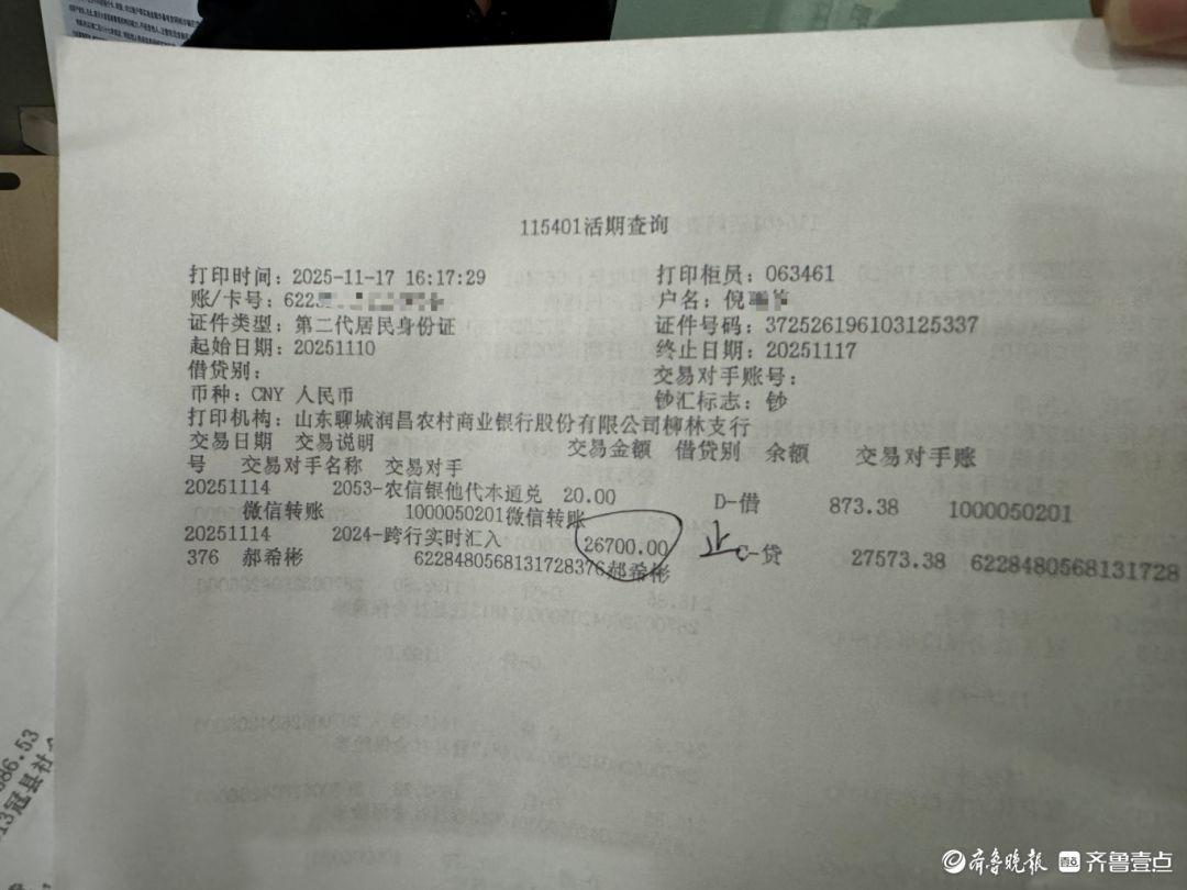 11月17日上午,银行系统一体化平台预警:倪某某银行卡收到一笔2.67万元转账,汇入方信息异常,银行工作人员立即通知倪某某到银行说明情况。