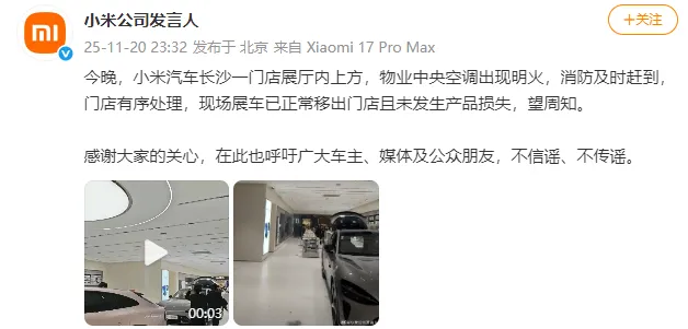 今晚,小米汽车长沙一门店展厅内上方,物业中央空调出现明火,消防及时赶到,门店有序处理,现场展车已正常移出门店且未发生产品损失,望周知。