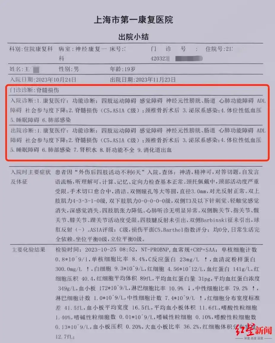 此外,王辉还伴随脊髓损伤(C5,ASIA C级)、颈椎骨折术后、泌尿系感染、体位性低血压、睡眠障碍、肺部感染、肾积水、肝功能不全、消化道出血等多个病症。