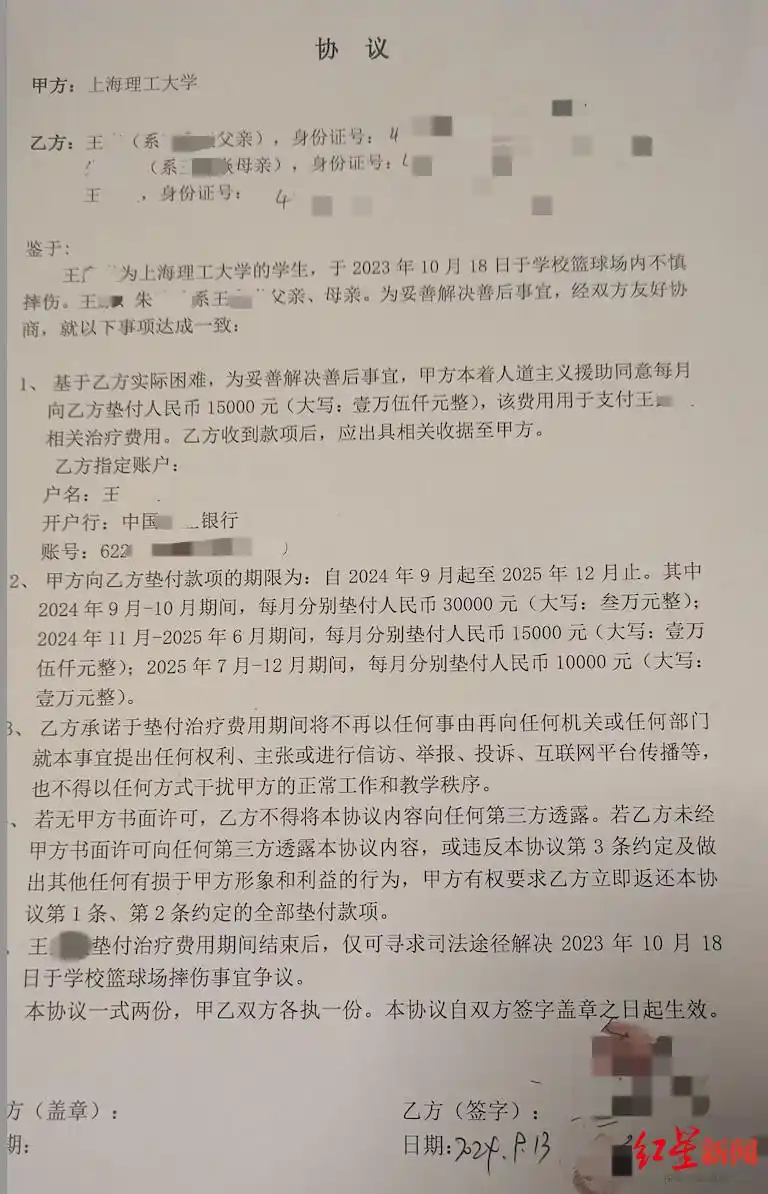 当年9月,校方拟定了新协议,提出在未来1年3个月内,分期支付24万。协议还约定,其间王辉一家不得进行举报、投诉、互联网平台传播,不得干扰学校工作和教学秩序等。双方签了字。