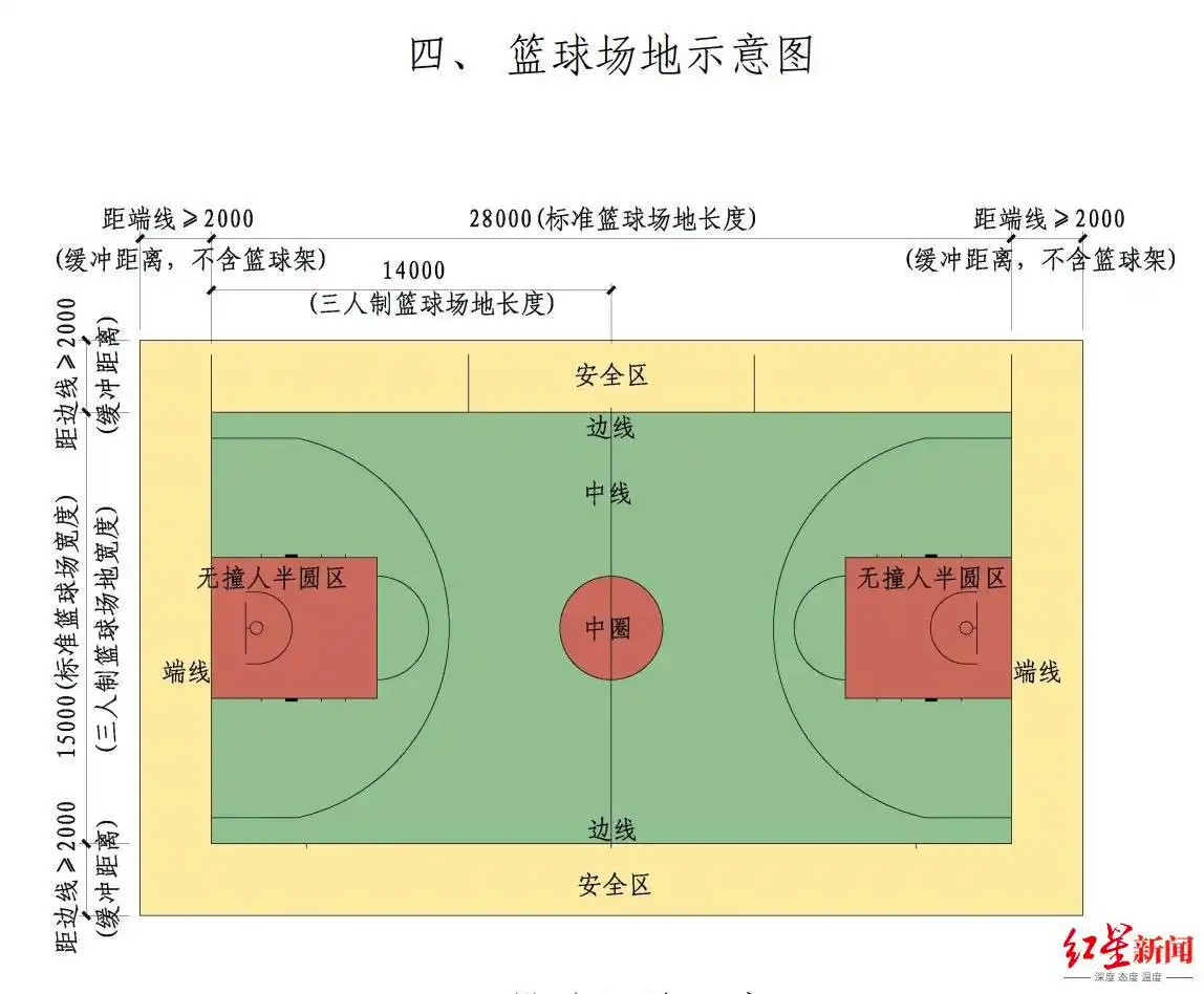此外,国家体育总局于2012年颁布的《“十二五”公共体育设施建设指导手册》明确,篮球场地缓冲区的边线、端线缓冲长度分别为2~6米、2~5米。