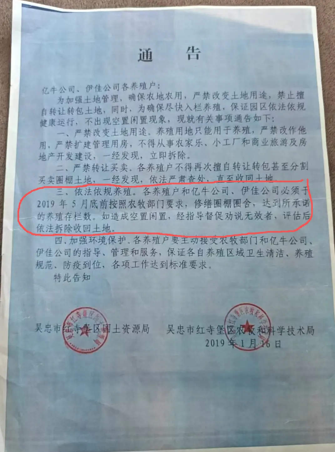 举报人称,早在2018年,区国土资源局、综合执法局和农牧局曾经对亿牛公司涉嫌土地违法的行为进行过查处。2019年1月,红寺堡区国土资源局和区农牧局(现农业农村局)曾联合下发《通告》,要求亿牛公司必须于2019年5月底前按照农牧部门要求,修缮圈棚圈舍,达到所承诺的养殖存栏数。如造成空置闲置,经指导督促劝说无效者,评估后依法拆除收回土地。但是,他们不清楚,为何亿牛公司没有进行整改,但是却没有被收回土地。