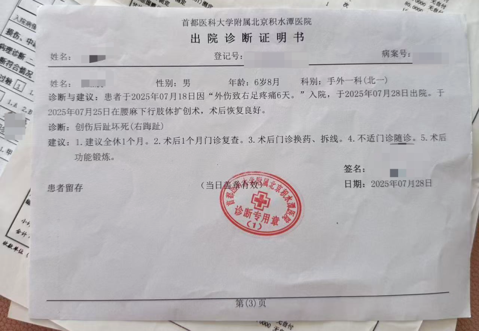 “去医大二是为了给航航接血管,接完后我们发现脚趾头效果不理想。”高女士说,不久后,他们又带着孩子前往了北京治疗。首都医科大学附属北京积水谭医院提供的出院诊断证明书显示,7月18日,航航因“外伤致右足疼痛6天”入院,“创伤后趾坏死”,“见趾骨基底离断处骨骺分离,骨折移位”,7月25日在腰麻下行肢体扩创术,术后恢复良好,于7月28日出院。