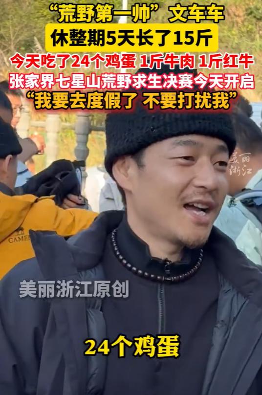 另外,被评为“荒野第一帅”的文车车休整期长了15斤,记者采访时称自己今天吃了24个鸡蛋、1斤牛肉、1斤红牛……称比赛是去度假。