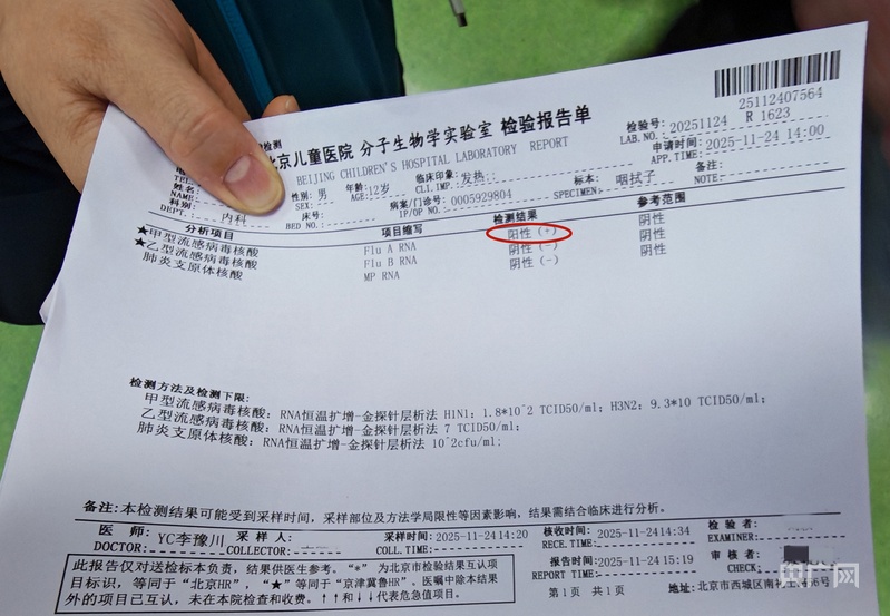 小杰的检测报告单显示甲流核酸呈阳性(央广网记者庞婷摄)