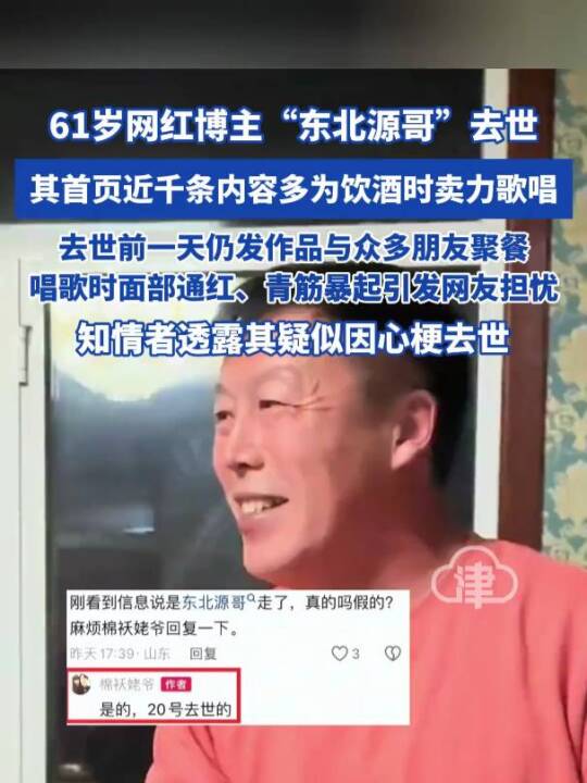 近日,经多位博主发文证实,网红“东北源哥”不幸离世。千万网红“棉袄姥爷”也在评论区确认“东北源哥”离世的消息,并透露源哥于11月20日离世。