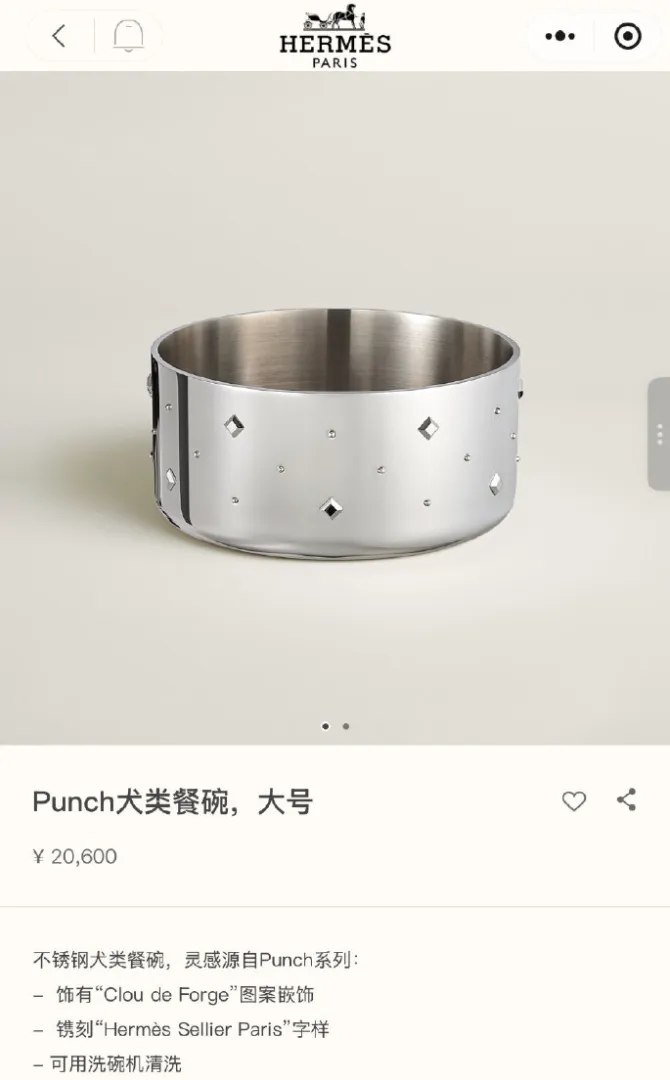 近日,有网友发现爱马仕官网上架了两款不同尺寸的不锈钢犬类餐碗,定价分别为18300元和20600元。产品介绍页显示,这款犬类餐碗材质为100%不锈钢,为法国制造。