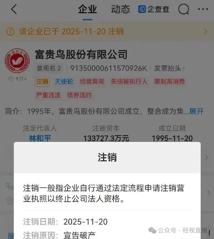11月24日消息,天眼查APP显示,日前,富贵鸟股份有限公司(下称富贵鸟)登记状态由存续变更为注销,注销原因为宣告破产。