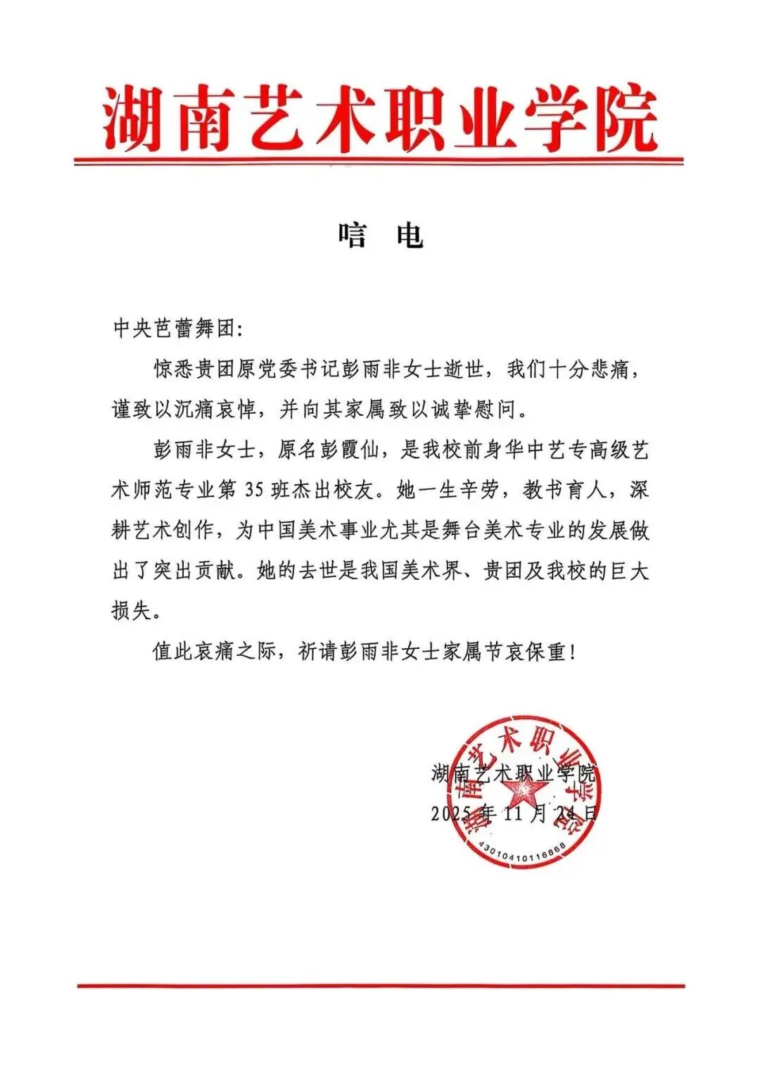 据湖南艺术职业学院消息,中国共产党党员、中央芭蕾舞团原党委书记彭雨非同志,因病医治无效于2025年11月6日在北京逝世,享年93岁。