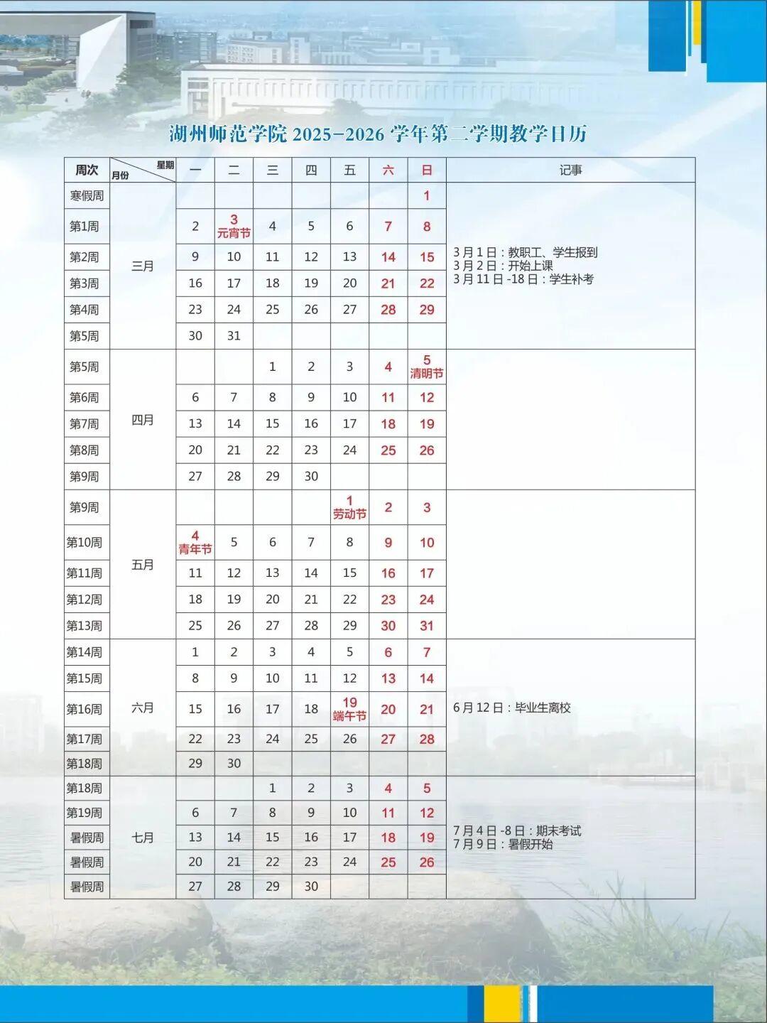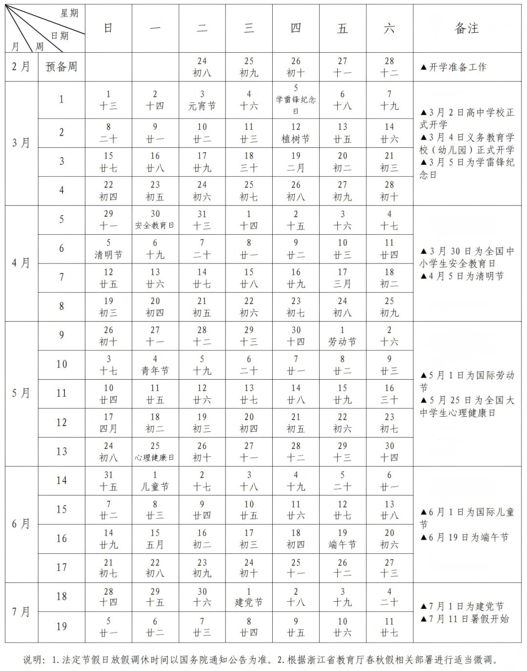 2025-2026学年第二学期,小学、初中、普高、中职(技工)定于2026年3月4日开学;2026年7月4日学期结束,7月5日放假,共十八周。幼儿园安排参照义务教育阶段学校执行。