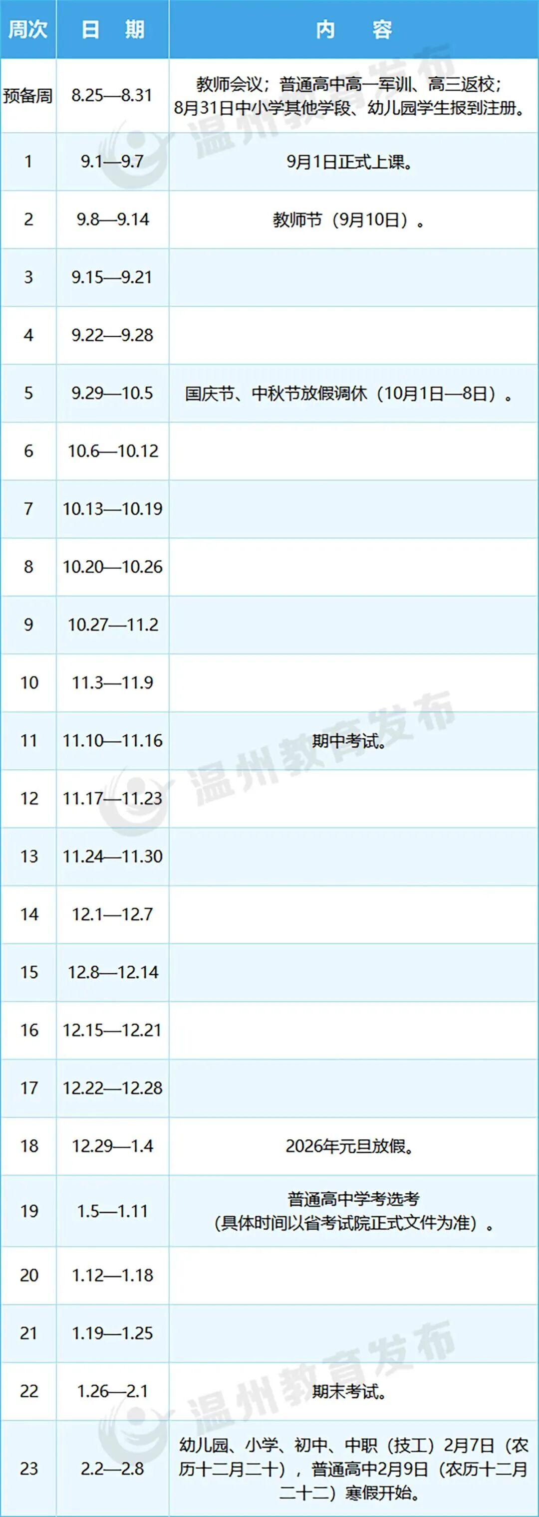 温州市2025-2026学年第一学期,幼儿园、小学、初中、中职(技工)2月7日寒假开始;普通高中2月9日寒假开始。