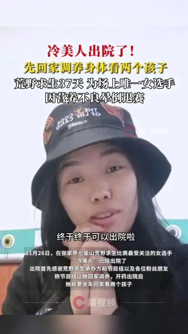 11月26日,荒野求生女选手“冷美人”杨朝芹发视频称自己出院了,将回家调养身体并照看两个孩子,感谢节目组和粉丝。