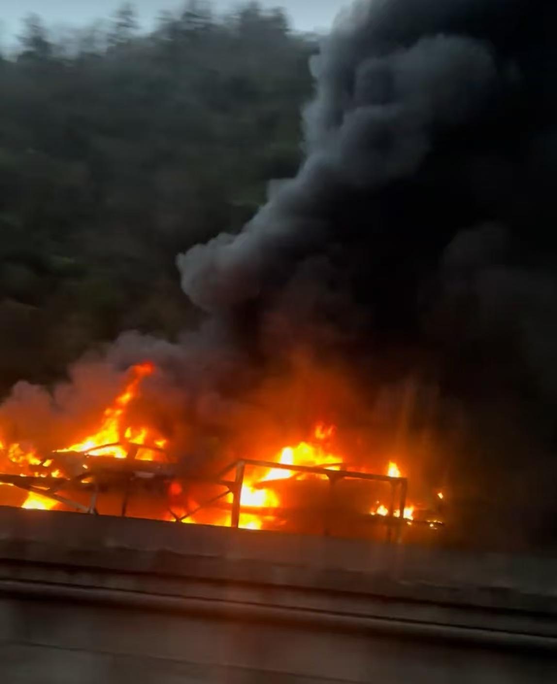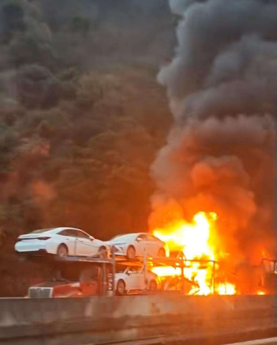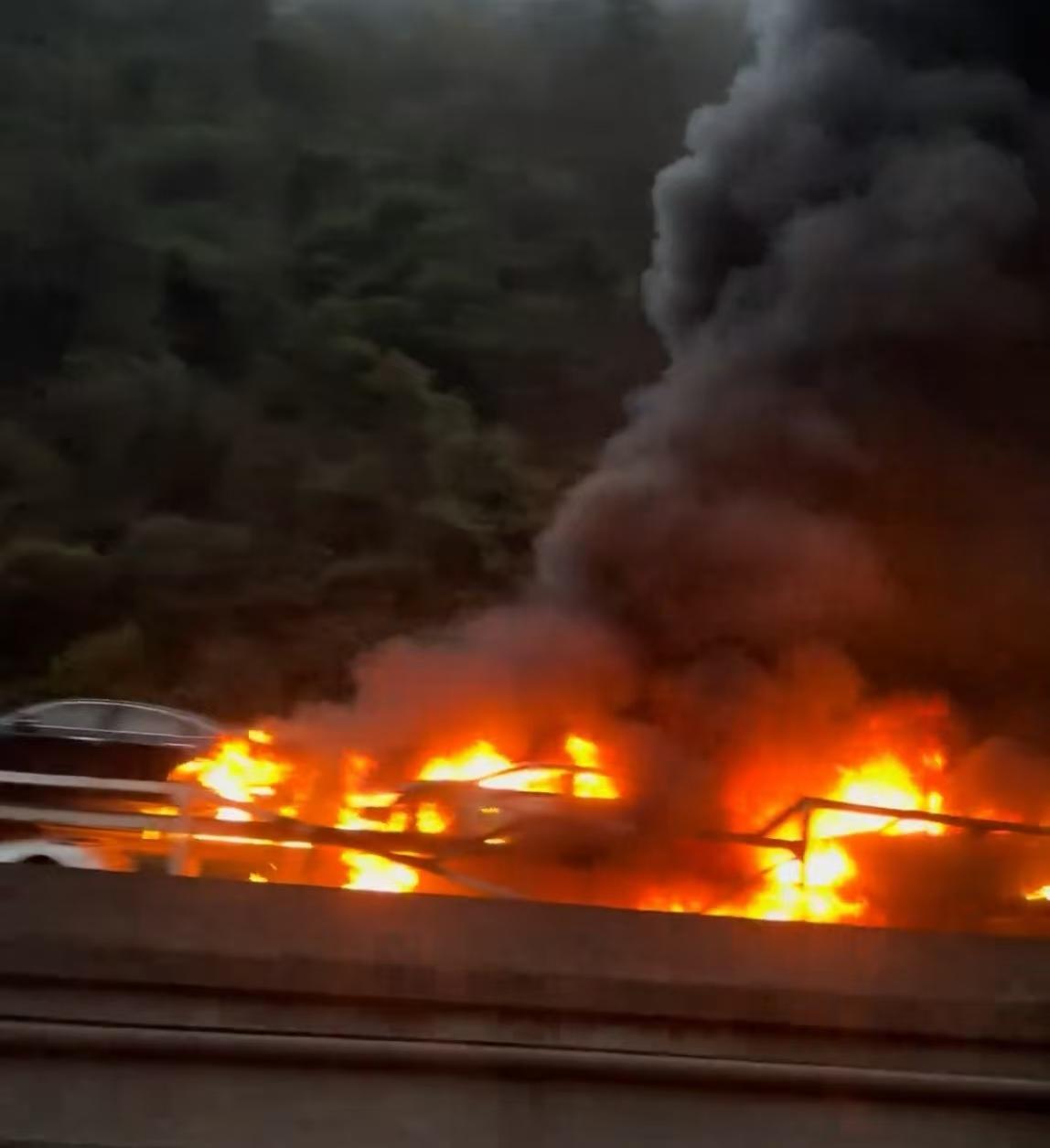 现场视频显示,火焰先是从运输车底层往上窜,很快将上层装载的新车吞没。受山间大风影响,火星不断向四周迸溅。该车前后车辆自行停止。视频发布者多是从另一条反方向的车道上拍摄的,浓烟形成的黑色烟柱在数公里外清晰可见。有目击者说,空气中弥漫着橡胶、塑料燃烧产生的刺鼻气味。粗略数一下,运输车辆拖挂两层车箱,有十余辆新车。