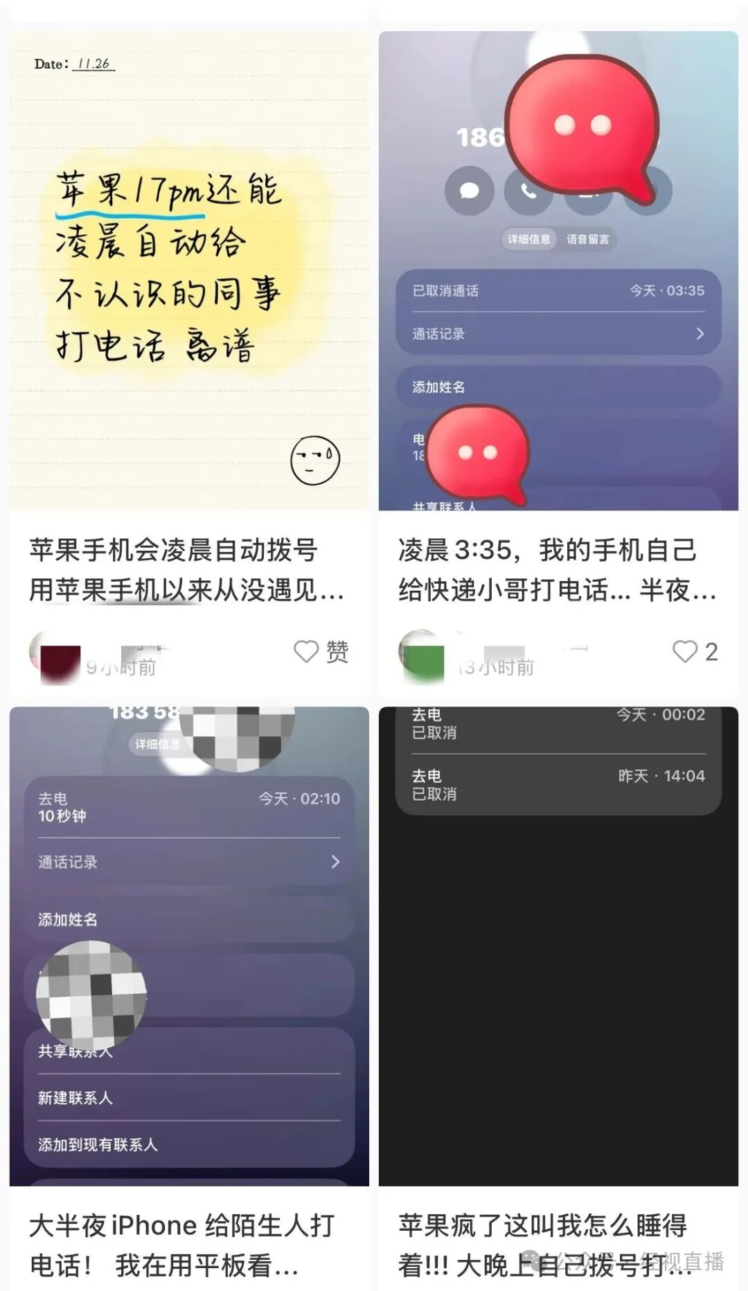 近日,多名iPhone用户在社交平台反映,更新iPhone手机至iOS 26.0.1版本后,手机在锁屏状态下半夜自动拨打电话给陌生人,被呼叫对象包括快递员、商家客服等。用户表示,当场被吓一跳,感觉既诡异又尴尬。这一现象引发用户对苹果手机安全性的担忧。值得注意的是,部分未更新至最新系统的老款iPhone也出现了类似问题。