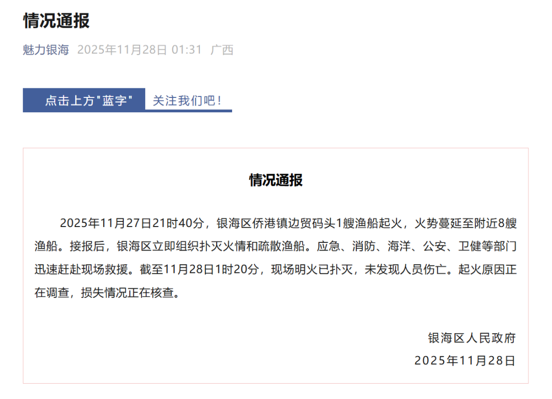 2025年11月27日21时40分,银海区侨港镇边贸码头1艘渔船起火,火势蔓延至附近8艘渔船。接报后,银海区立即组织扑灭火情和疏散渔船。应急、消防、海洋、公安、卫健等部门迅速赶赴现场救援。截至11月28日1时20分,现场明火已扑灭,未发现人员伤亡。起火原因正在调查,损失情况正在核查。