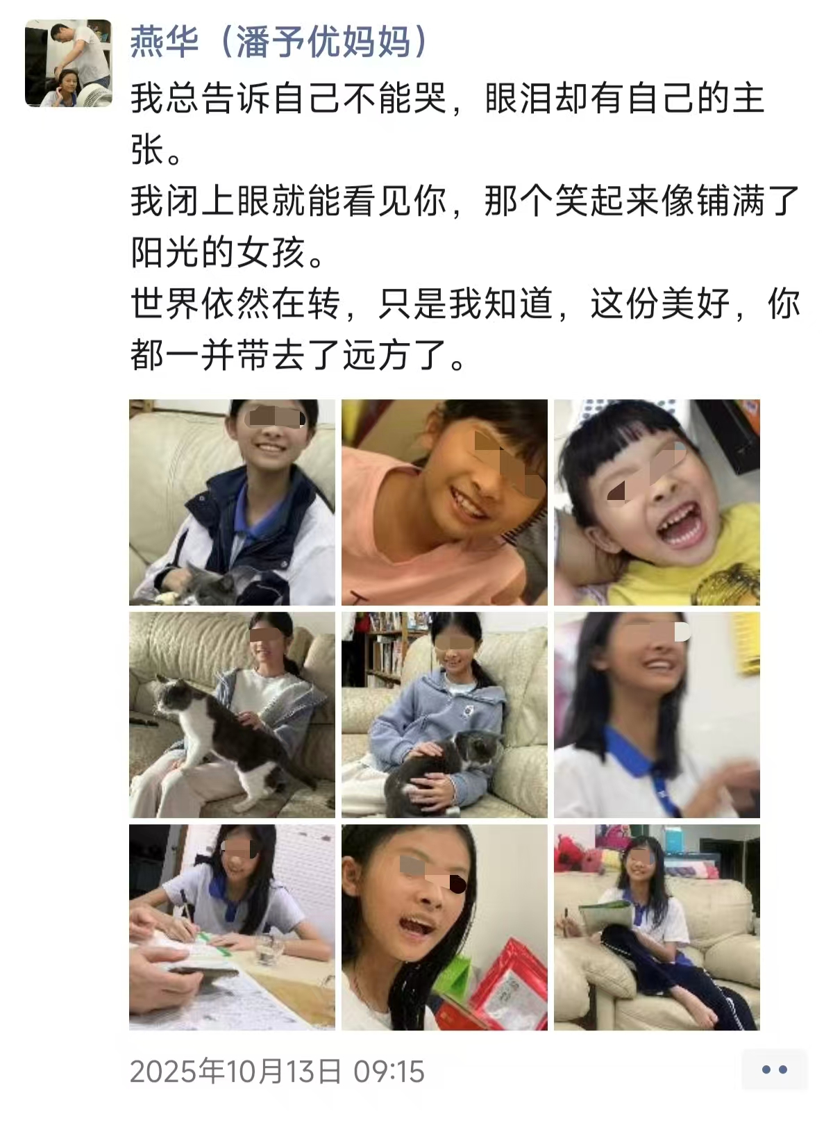 2025年9月17日:“我拿起优优的账号,假装那是她还在对我说话。直到点开自己的对话框,看见那个再熟悉不过的头像旁,静静躺着两个字‘妈妈’,那一刻,我的心像被狠狠撕开。我多想再你听亲叫我一声‘妈妈’。”
