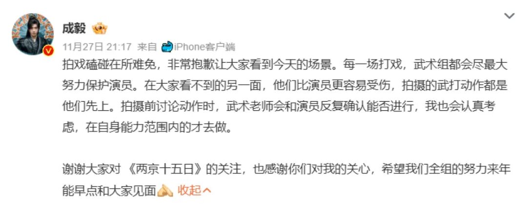 11月27日,网传视频显示,知名男演员成毅在拍戏时疑似后脑勺触地。不少成毅粉丝要求剧组重视安全问题,引发广泛关注。当晚,成毅发微博回应受伤,表示“拍戏磕碰在所难免”。
