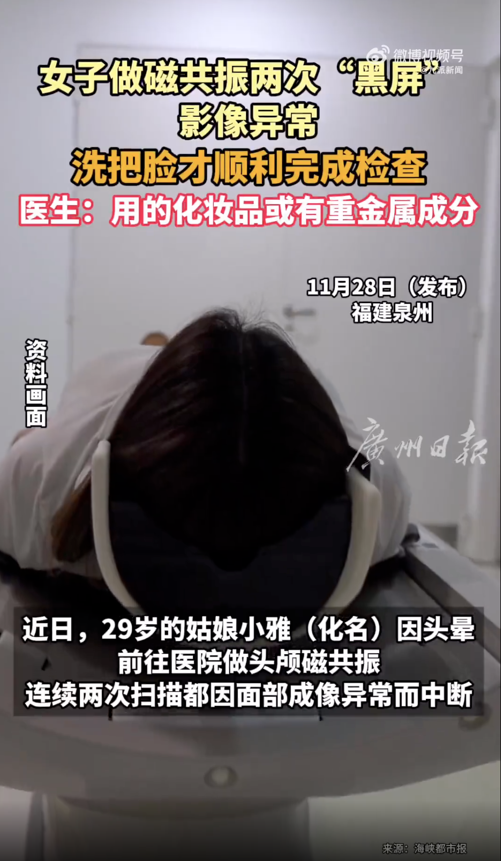 近日,29岁的泉州姑娘小雅(化名)因头晕,前往福建医科大学附属第二医院做头颅磁共振。不料,连续两次扫描都因面部成像异常而中断。