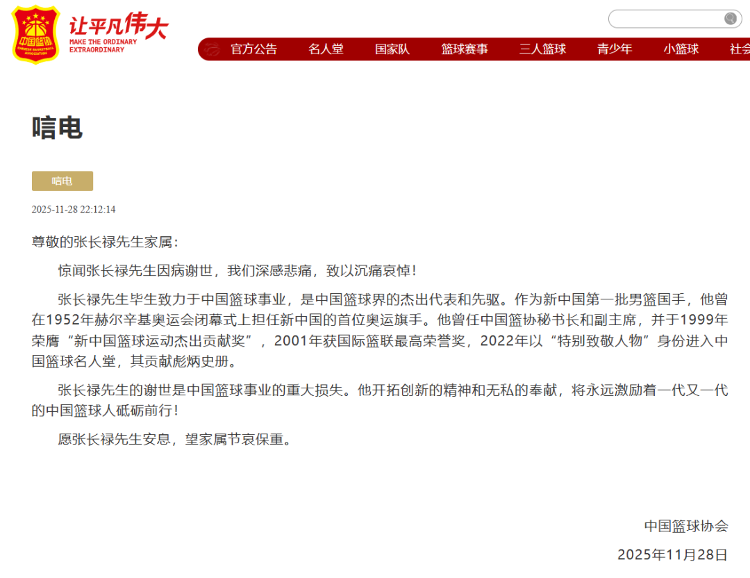 张长禄先生的谢世是中国篮球事业的重大损失。他开拓创新的精神和无私的奉献,将永远激励着一代又一代的中国篮球人砥砺前行!