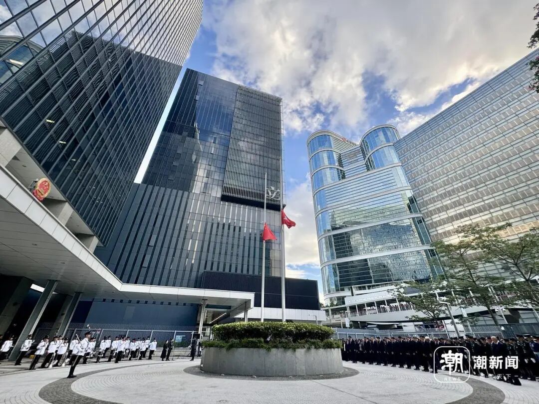 11月29日,香港特区政府总部前,国旗与区旗缓缓降至半旗,全城进入为期三日的哀悼期。潮新闻记者 石怡锋 摄