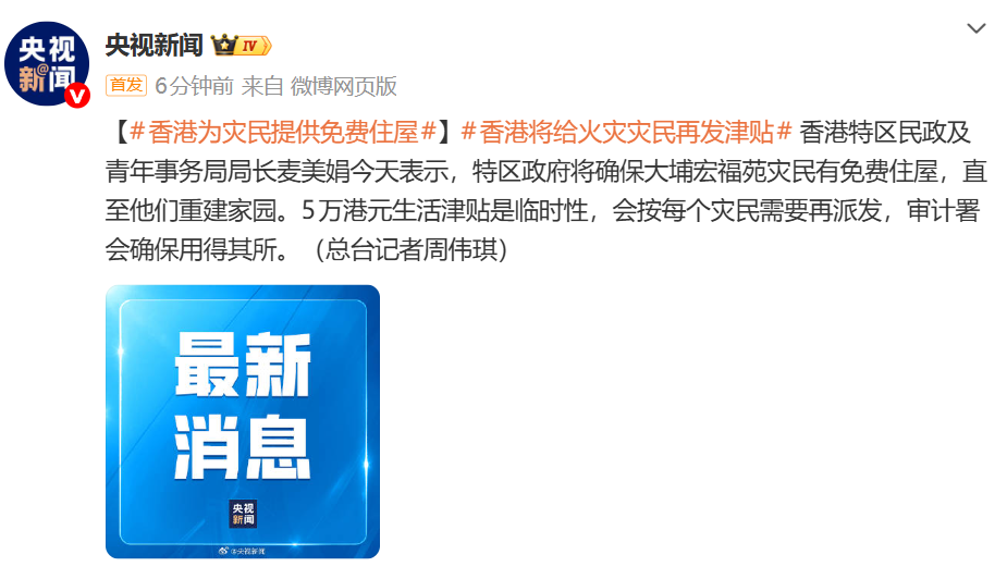 据央视新闻11月30日报道,香港特区民政及青年事务局局长麦美娟今天表示,特区政府将确保大埔宏福苑灾民有免费住屋,直至他们重建家园。5万港元生活津贴是临时性,会按每个灾民需要再派发,审计署会确保用得其所。