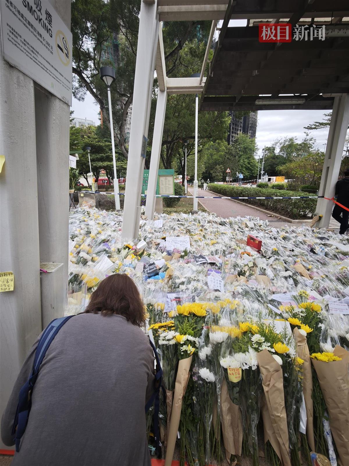 11月30日,在宏福苑设置的吊唁点,陆续有市民前来献花吊唁,献花队伍从吊唁点往附近大埔河边延伸,约有两三公里。