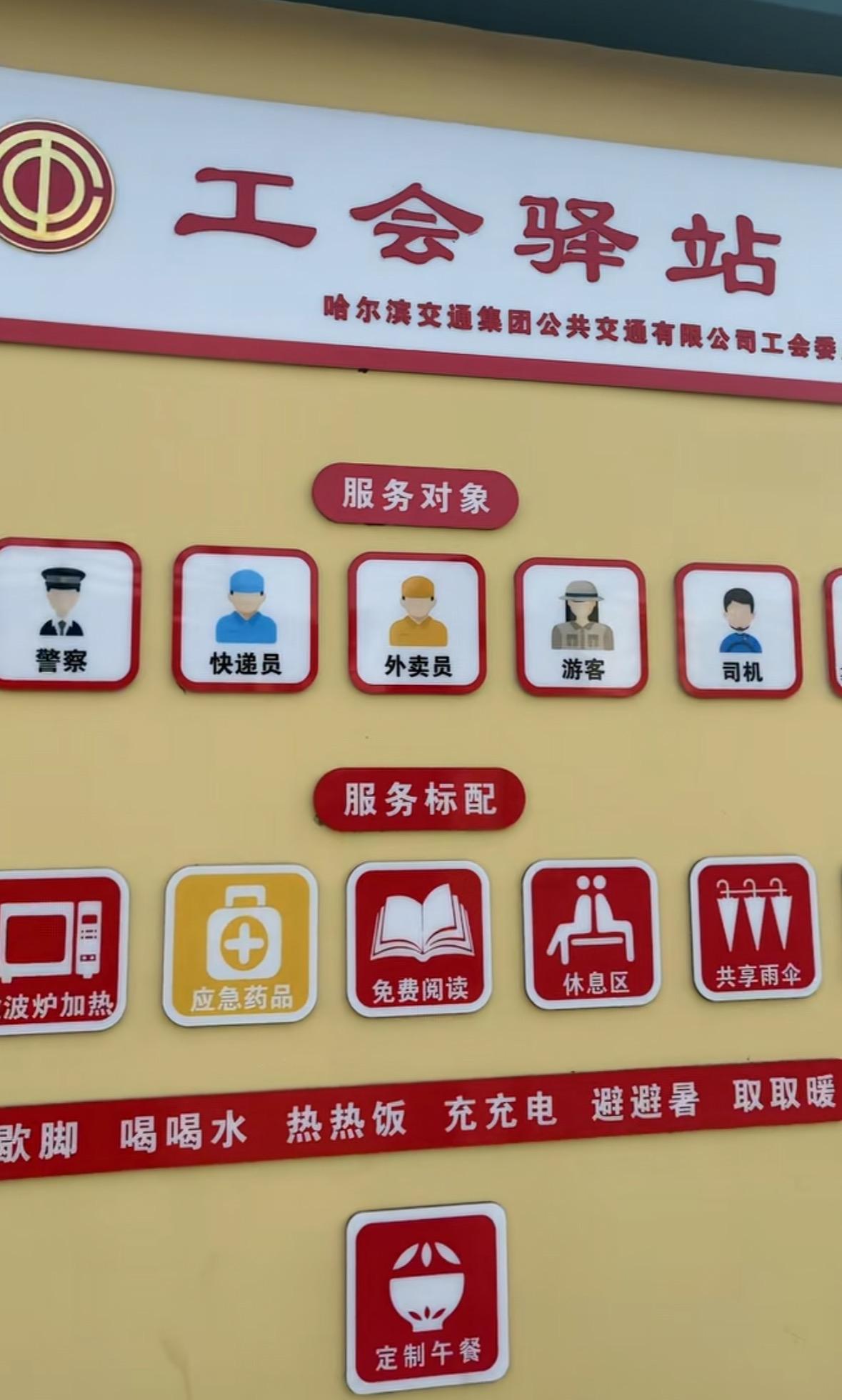 记者搜索发现,2024年8月有媒体报道哈尔滨的工会驿站,文中提到:该市利用公交场站、调度室等办公场所,建设了38处“工会驿站”和公交大食堂,为户外劳动者群体歇脚、喝水、热饭、充电、避暑、取暖等服务,同时为市民、公交乘客、外地游客提供应急药品、免费阅读、候车休息、如厕等服务。