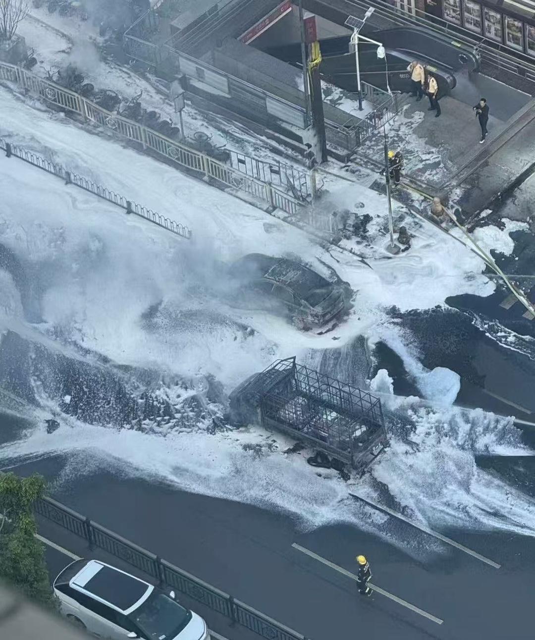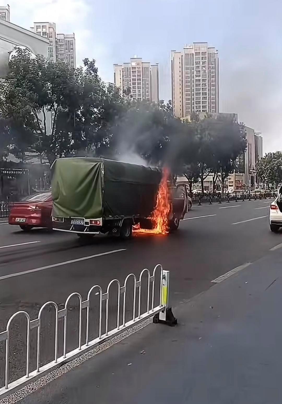 一名周边商铺员工告诉红星新闻记者,最先起火的是一辆披着绿布的小货车,车门处于打开状态。货车疑似漏油,随后火势蔓延到周边机动车道及人行道,约有几十米长,路边一整排的电动车也被烧着。14时许,消防车抵达现场,目前明火已经扑灭。