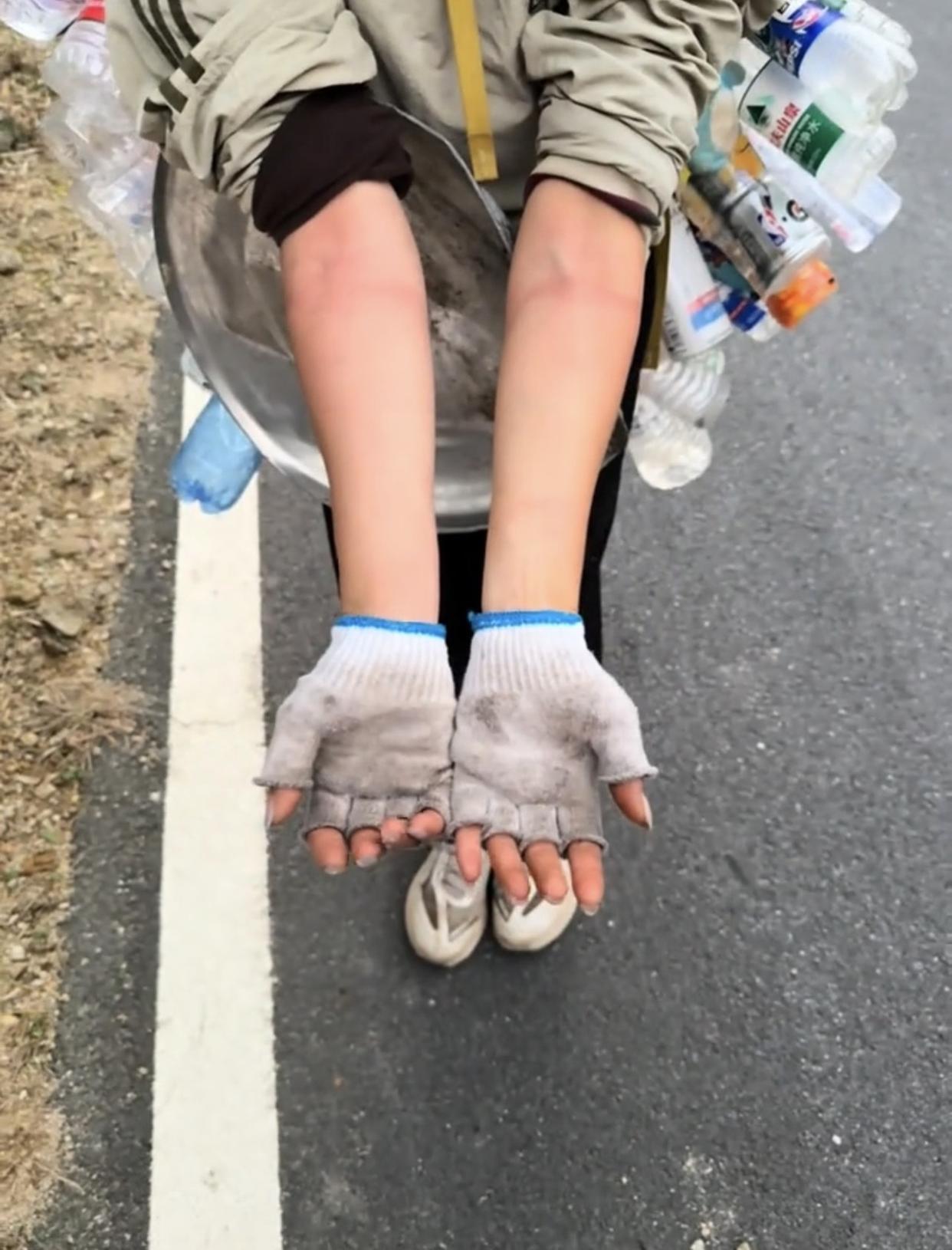每次上山,陈晨总会带一根长长的绳子、两个蛇皮袋以及一双劳保手套。爬山的路上,遇见的水瓶和垃圾,她都会放进袋子里。瓶子比较占地方,陈晨还想了一个用绳子把瓶子串起来的办法——她利用瓶盖夹住绳子,一个个串起来就能背在身上。陈晨喜欢跑着下山,跑起来的时候瓶子哗啦啦地响,她也觉得很有成就感。