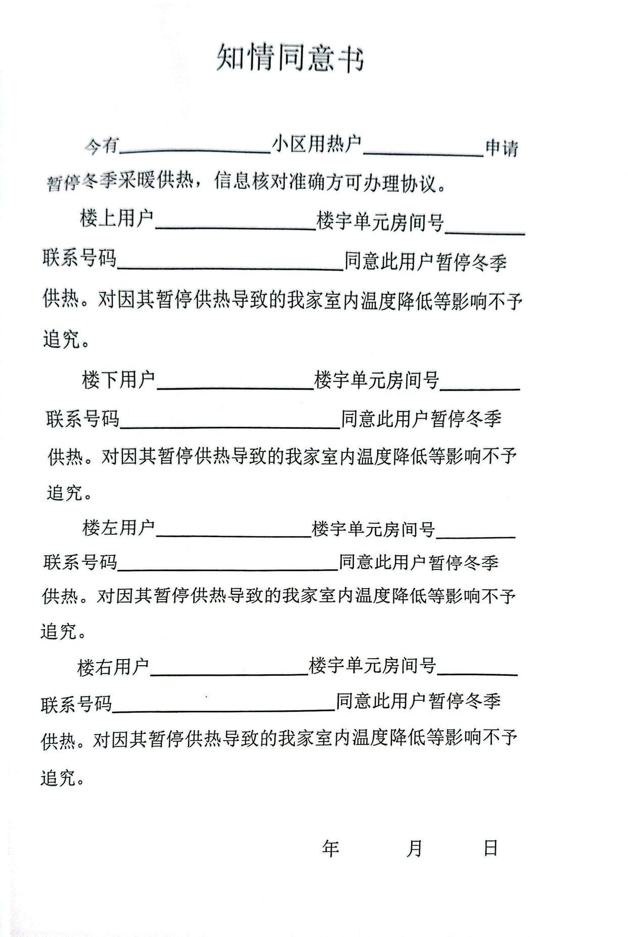11月24日,李磊和多位报停业主再次维权时,供热公司又提出新要求:“报停需要上下左右邻居同意,否则不给办”,给出的解释是“为了避免后续邻里供暖纠纷”。李磊向华商报大风新闻记者出示了这份需要左邻右舍签字的《知情同意书》,上面明确要求楼上、楼下、楼左、楼右四户签字,同意该用户暂停冬季供热,并对因其暂停供热导致的自家室内温度降低等影响不予追究。