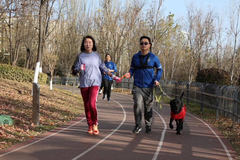 “大家在群里报名,根据个人想跑的距离,一位盲友搭配一位陪跑志愿者,组成一组。”志愿者史尚宏说,有的时候甚至是盲友带着自己跑,她一开始只能跑一圈,现在一口气能跑四圈。