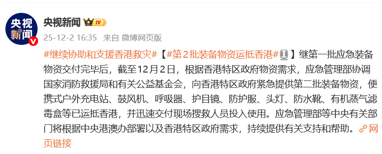 继第一批应急装备物资交付完毕后,截至12月2日,根据香港特区政府物资需求,应急管理部协调国家消防救援局和有关公益基金会,向香港特区政府紧急提供第二批装备物资,便携式户外充电站、鼓风机、呼吸器、护目镜、防护服、头灯、防水靴、有机蒸气滤毒盒等已运抵香港,并迅速交付现场搜救人员投入使用。应急管理部等中央有关部门将根据中央港澳办部署以及香港特区政府需求,持续提供有关支持和帮助。