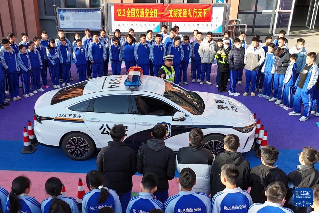 12月2日,在河北省石家庄市栾城区第五中学,石家庄市公安局栾城分局交通管理大队民警为学生们讲解如何避开汽车盲区,远离危险 (无人机照片)。