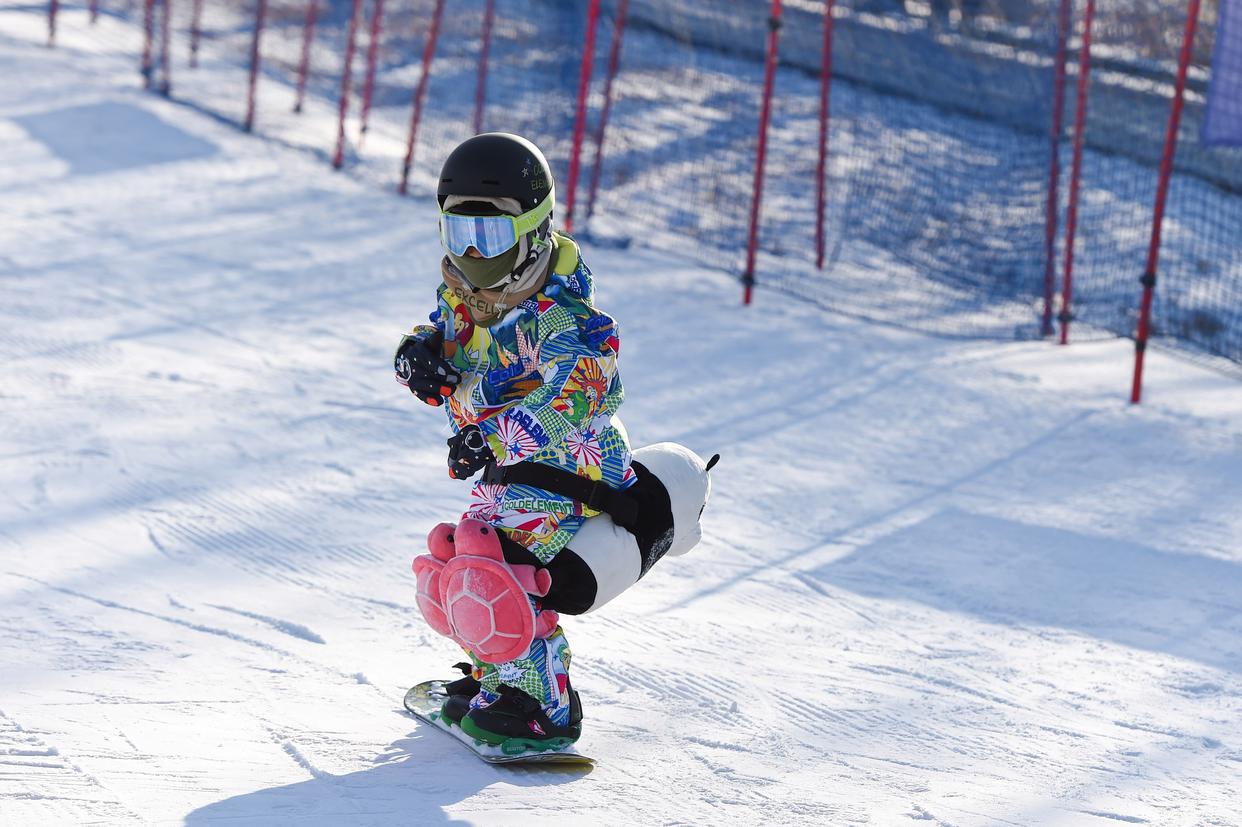 12月3日,吉林市一小学生在吉林市纳美山谷度假区学习单板滑雪。 新华社记者 颜麟蕴 摄