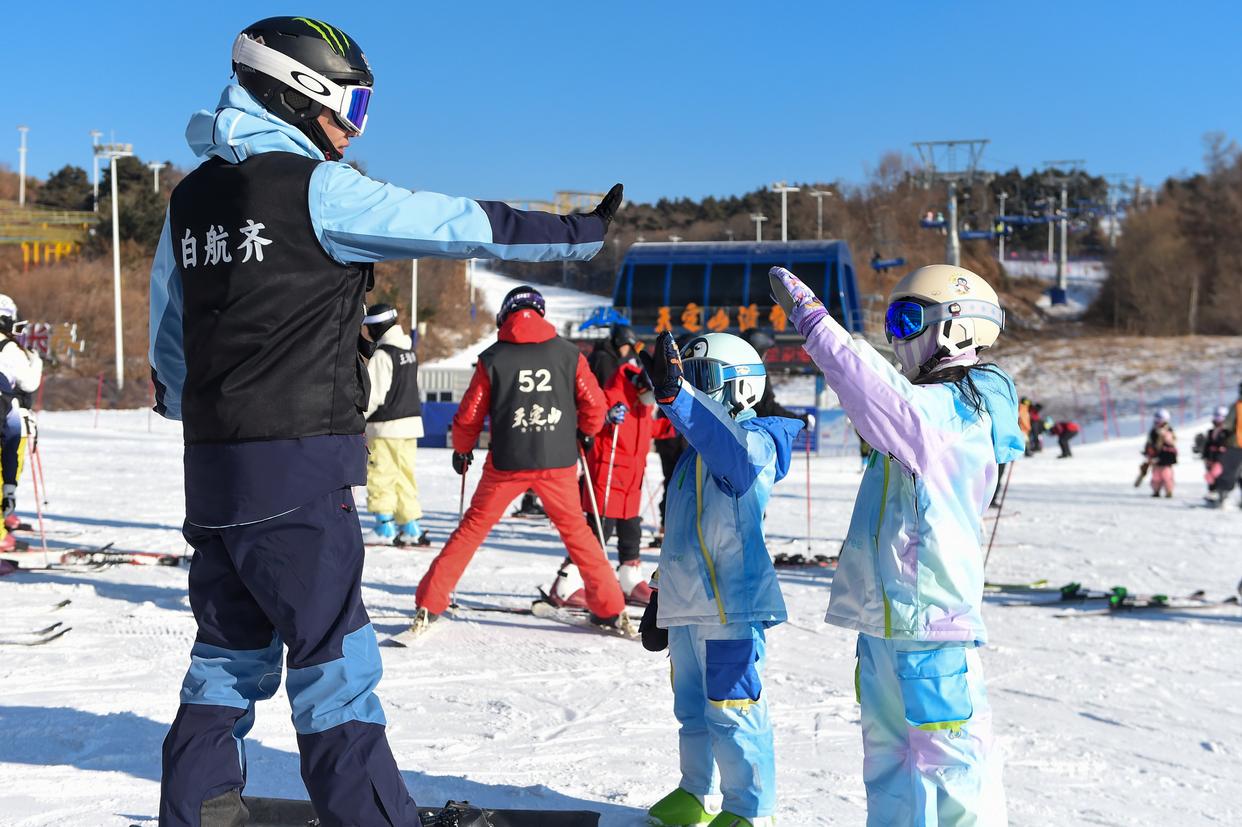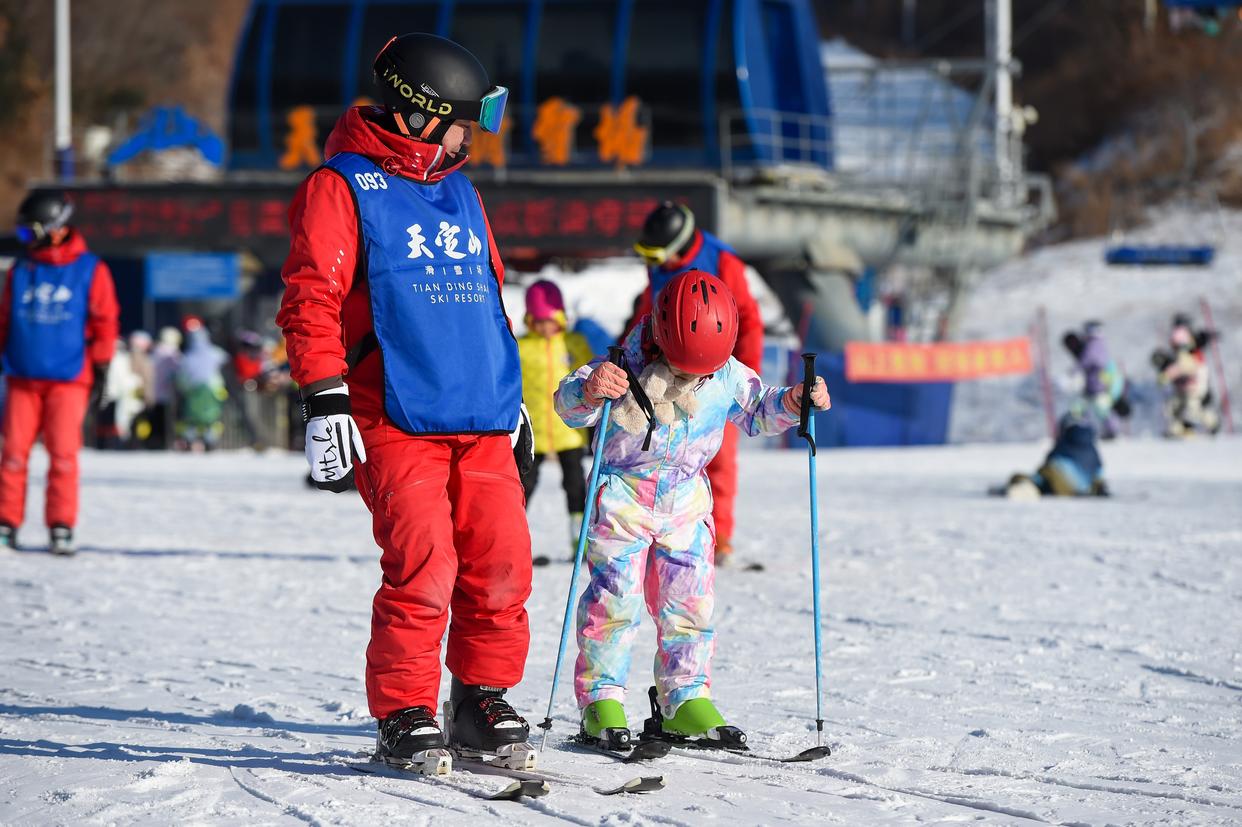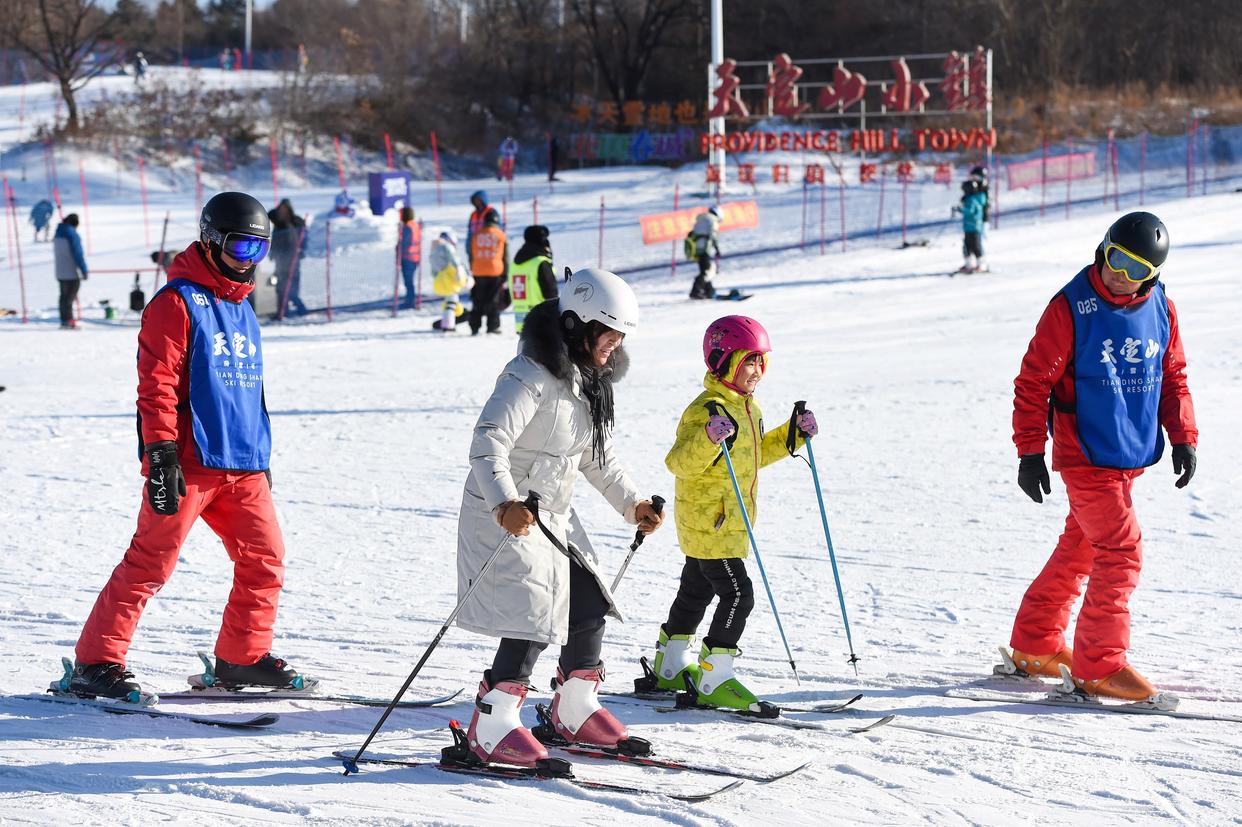12月3日,在长春市天定山滑雪场,学生和家长在教练的指导下练习滑雪。 新华社记者 张楠 摄