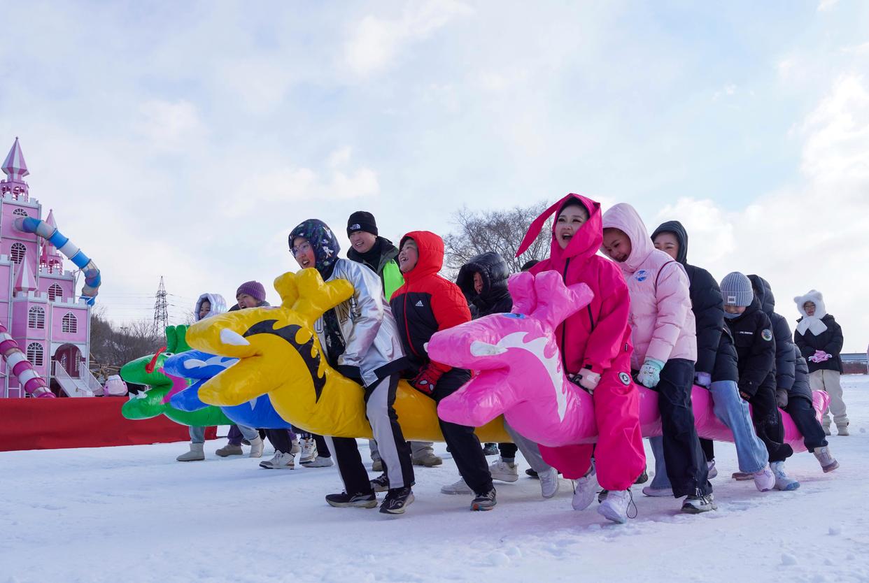 12月3日,吉林市中小学生在吉林市纳美山谷度假区参加“雪地龙舟”趣味活动。 新华社记者 颜麟蕴 摄