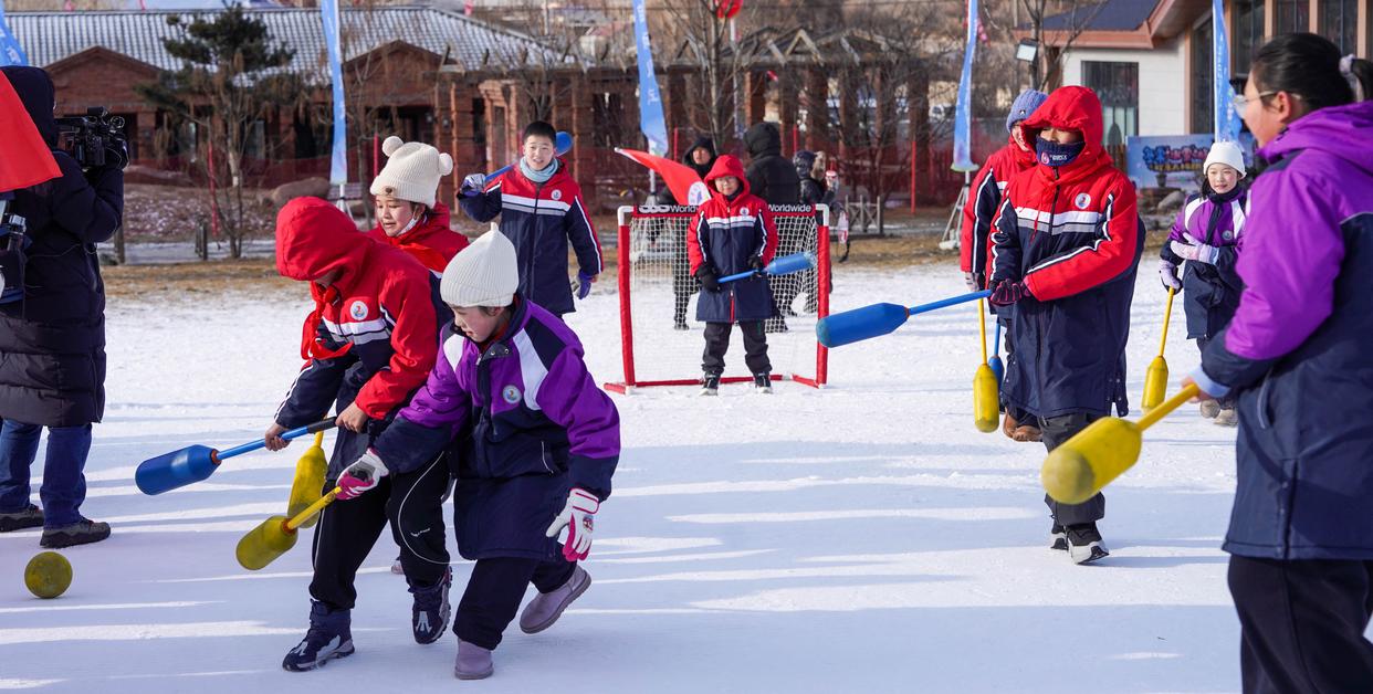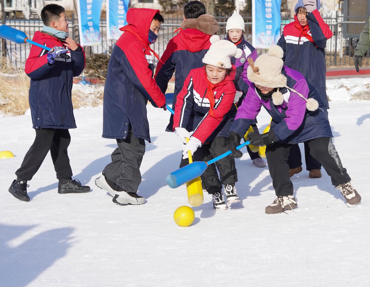 12月3日,吉林市第二实验小学学生在吉林市纳美山谷度假区体验雪上软式棒球。 新华社记者 颜麟蕴 摄