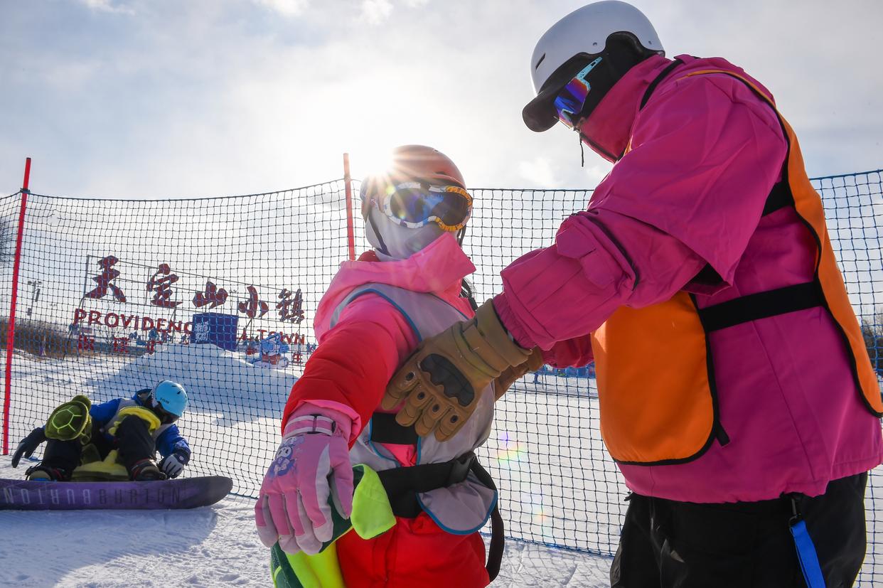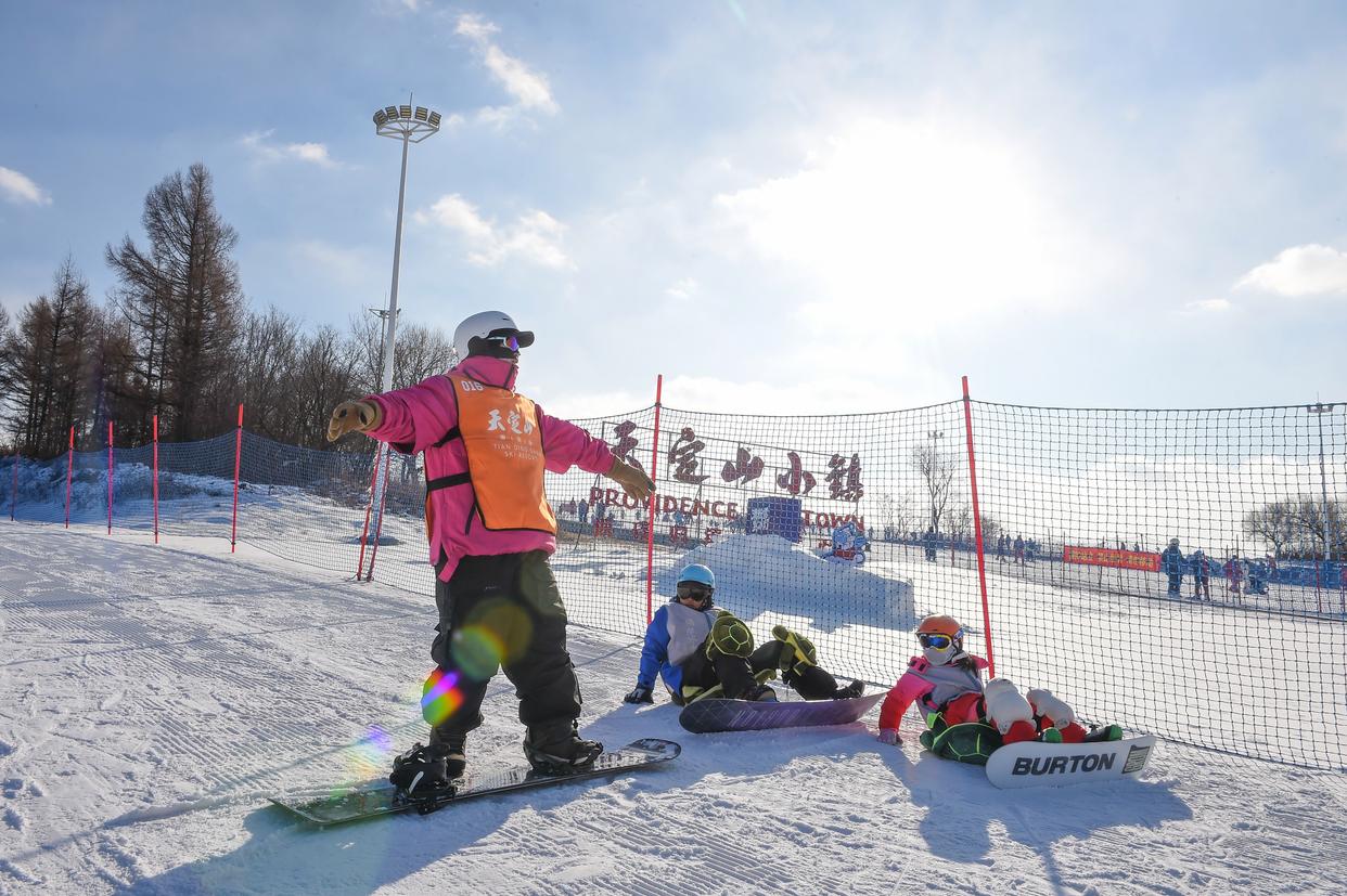 12月3日,吉林市中小学生在吉林市纳美山谷度假区体验单板滑雪。 新华社记者 颜麟蕴 摄