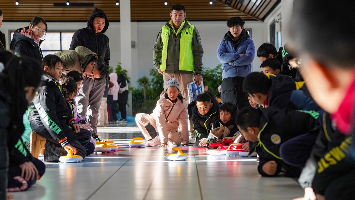 12月3日,吉林市松江东路小学校学生在吉林市纳美山谷度假区体验旱地冰壶。 新华社记者 颜麟蕴 摄