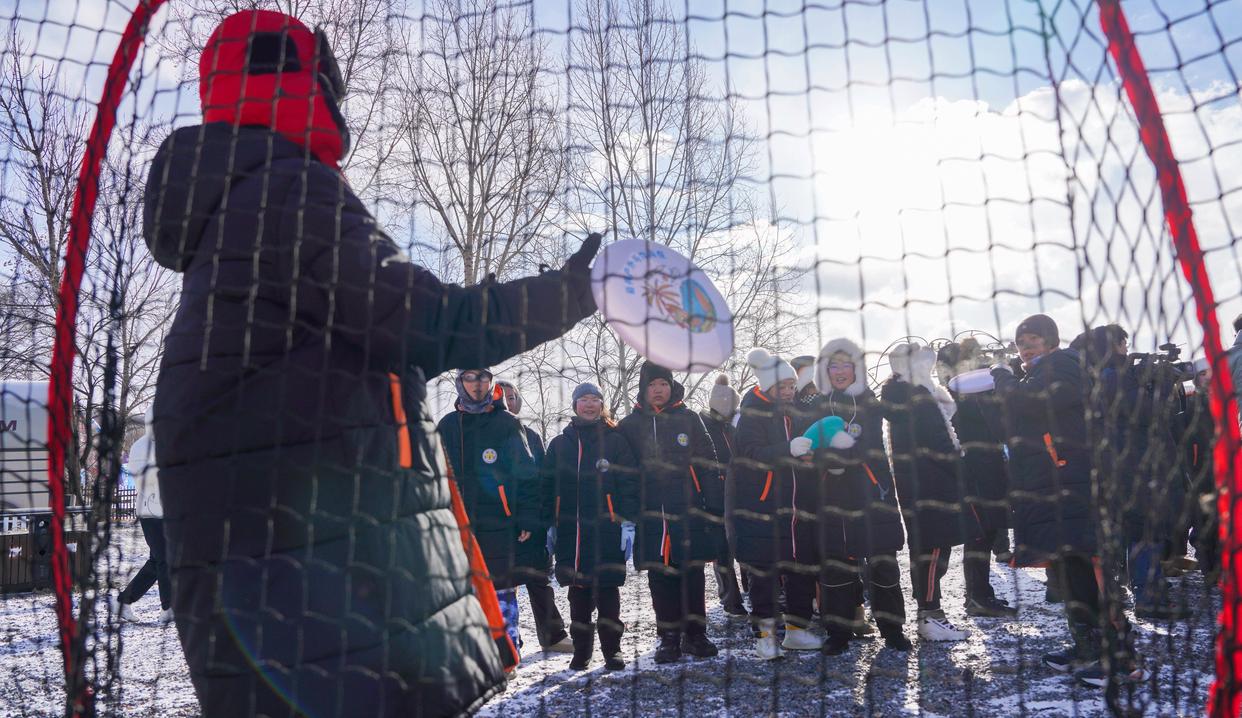 12月3日,吉林市第一实验小学学生在吉林市纳美山谷度假区体验雪地飞盘。 新华社记者 颜麟蕴 摄
