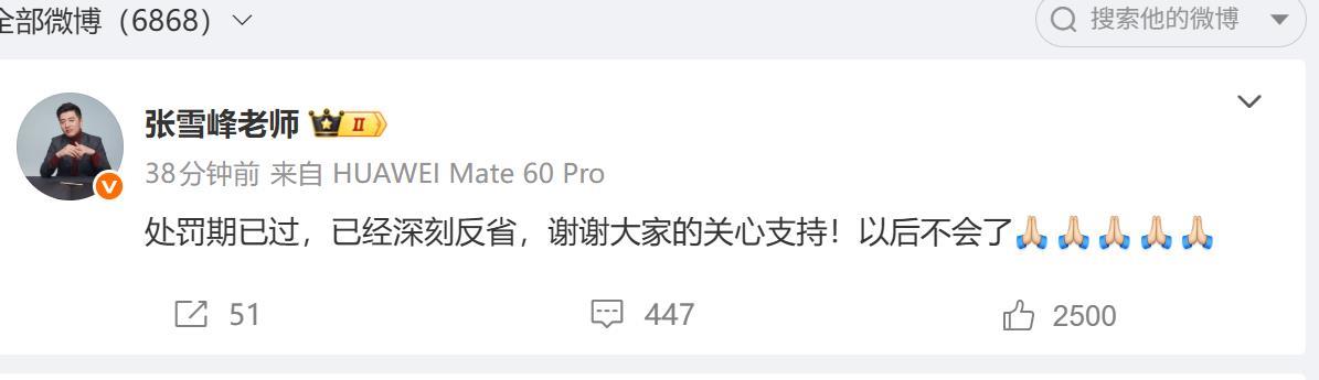 10月22日16时41分,张雪峰微博恢复了更新,其抖音、快手、小红书、B站等多平台个人账号均恢复正常,可被用户关注。在当晚的直播,张雪峰对网友称是本人,好久不见。