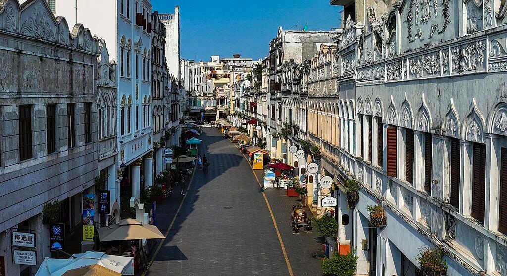 骑楼外表有精致的雕花和洋派装饰,中西合璧,色彩多样,在阳光照耀下格外吸引眼球。