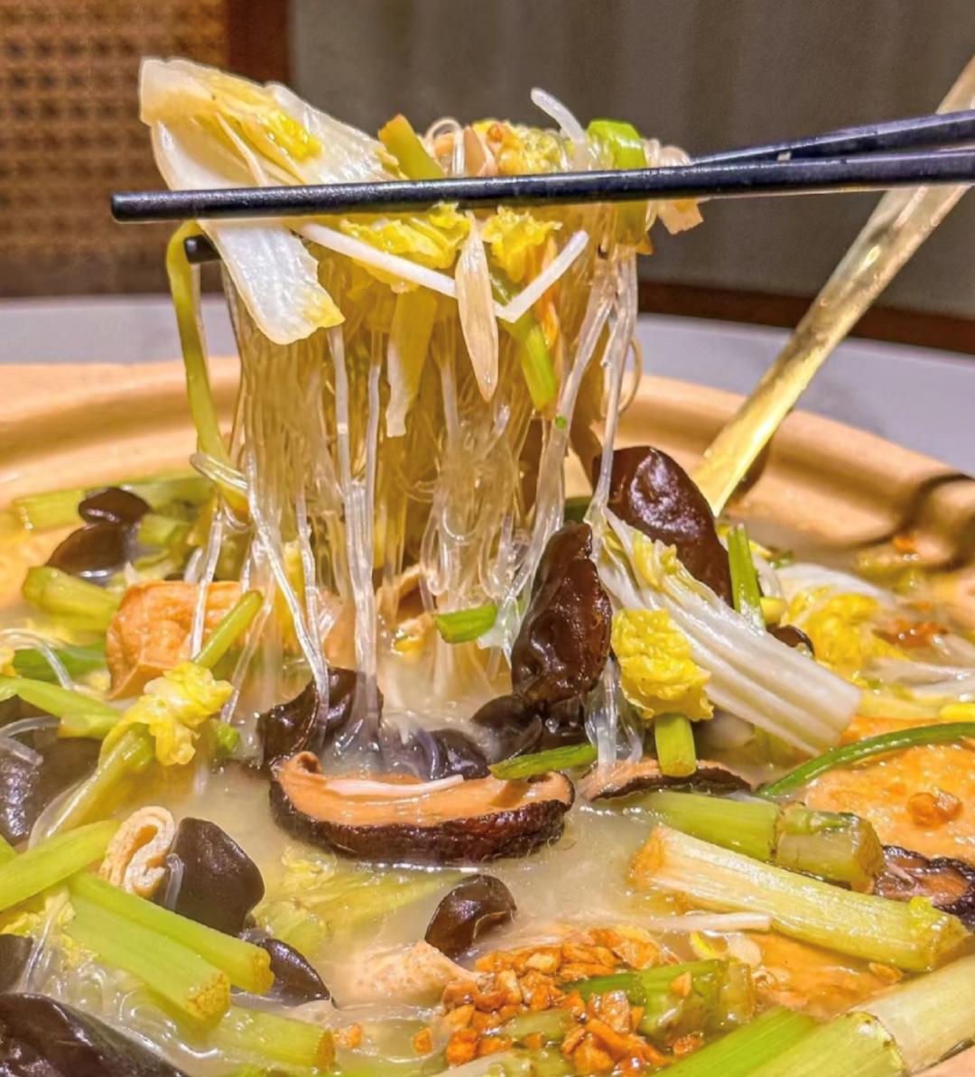 除了迷人的自然风光与深厚的人文底蕴,海南的美食也是电影中不可或缺的“亮色”。下面这个场景里,一行人围坐在热气腾腾的斋菜煲前,边吃边聊,温情治愈。