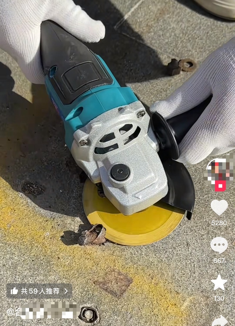 高先生来合肥定居已六年,从事房屋装修工作,手头有工具,也有动手能力。第二天,他就带上角磨机等工具,将绊倒女儿的那段钢筋头给铲除掉,同时用手机记录下了全过程,发布在抖音上。