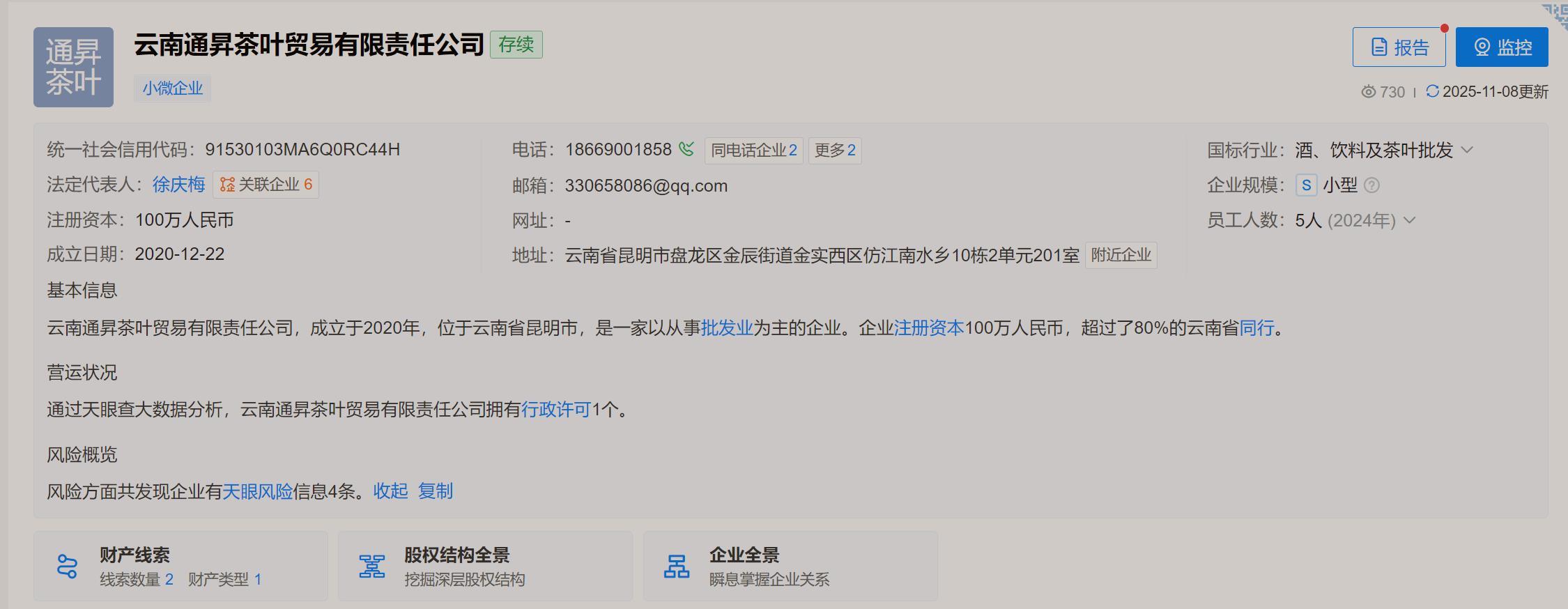 天眼查工商信息显示,云南通昇茶叶贸易有限责任公司成立于2020年12月,法定代表人为徐庆梅,注册资本100万元人民币,经营范围含酒、饮料及茶叶的销售,茶叶包装设计等。股东信息显示,该公司由沈文杰、徐婷婷分别持股90%、10%。值得一提的是,2024年年报信息显示,该公司职工基本医疗保险参保人数为5人,生育保险、工伤保险、城镇职工基本养老保险、失业保险参保人数均为0人。